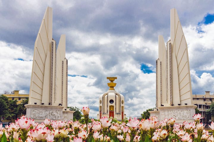 Het Democratie Monument op de Rachadamnoen (‘Koninklijke Weg’) in vrijwel onbereikbaar geworden door hekken en tuinen, zoals ook op bovenstaande afbeelding is te zien. Bovendien staat er nu in het midden ook een tekst geplaatst die zegt ทรงพระเจริญ song phra charoen wat ‘Leve de Koning’ betekent.