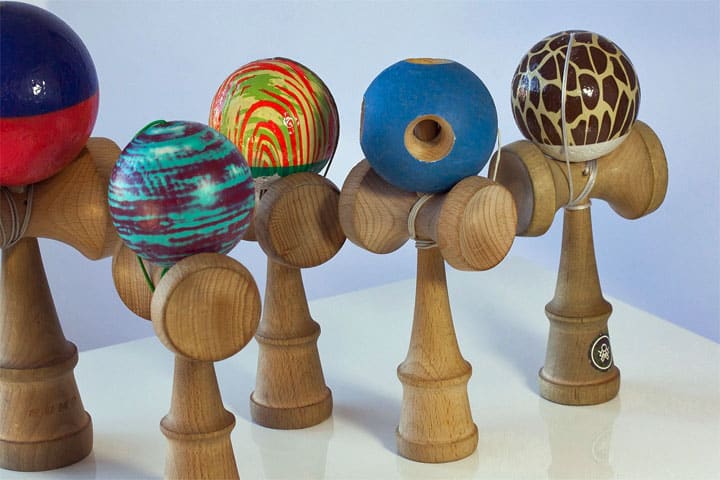 “Kendama: het eeuwenoude Japanse behendigheids-speeltje, bestaande uit een houten handvat (Ken) en een houten bal (Dama). De bal en het handvat zitten aan elkaar met een touw. De bal kan met een zwiep op de cups geworpen worden, en na enig oefenen is het de truc om aaneensluitend de bal van de ene cup naar de andere te zwiepen, steeds sneller en moeilijker. Een perfecte training van oog-hand coördinatie”.