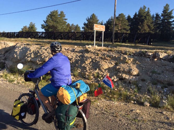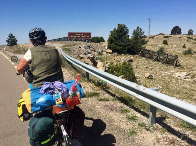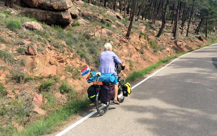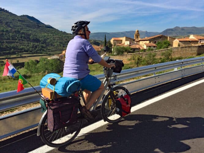 “In 2016 zijn we met een Gazelle e-bike op de fiets van Alkmaar naar Lissabon gefietst. We hadden kampeerspullen mee en waren geheel zelfvoorzienend inclusief de mogelijkheid om zelf warme maaltijden te bereiden. Hierdoor waren we behoorlijk aan gewicht. De fietsen wegen elk 26 kg en met bagage waren ze elk 54 kg. Het spreekt voor zich dat de accu actieradius afhankelijk is van het gewicht van de fiets en de berijder, de weers- en wegomstandigheden en de hoeveelheid energie die je aan de accu vraagt. We hadden accu’s van 400 Watt en hadden elk ook een reserve accu, die we ook dagelijks gebruikten.