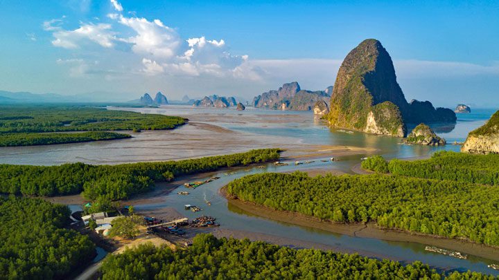 De absolute nummer een bezienswaardigheid in het zuiden van Thailand is de wereldberoemde Phang Nga Baai. Je vindt er de meest schitterende rotsformaties die je maar kunt bedenken. En dat op een open zee. Met de longtailboot scheur je urenlang langs immense rotsen en met een kayak kun je een aantal indrukwekkende grotten bezoeken.