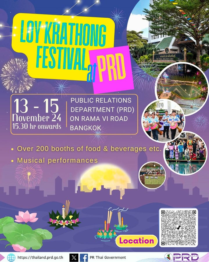 Van 13 tot 15 november 2024 organiseert de afdeling Public Relations (PRD) het Loy Krathong festival op het hoofdkantoor aan de Rama VI Road in Bangkok. Zowel Thaise bezoekers als buitenlanders zijn vanaf 15.30 uur van harte welkom om deel te nemen aan dit kleurrijke evenement dat in het teken staat van Thaise tradities, veilige festiviteiten en milieubewustzijn.