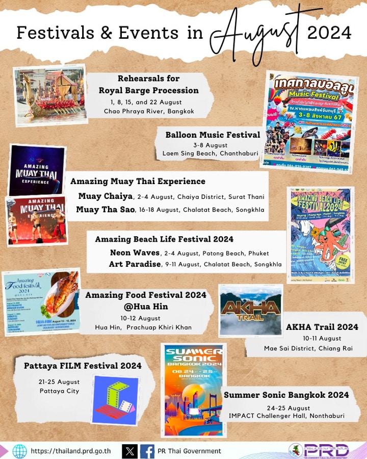In augustus 2024 organiseert de Koninklijke Thaise Marine vier van de twaalf repetities voor de Royal Barge Procession ter voorbereiding op de Royal Kathin ceremonie die op 27 oktober in Wat Arun plaatsvindt. Daarnaast zijn er deze maand tal van andere evenementen en festivals. Hieronder een overzicht van de hoogtepunten: