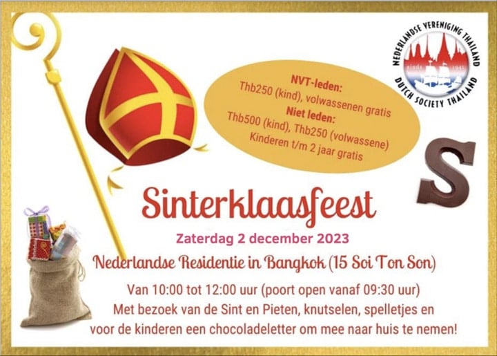 Ja, het is al bijna weer zover; de leukste dag voor de kinderen, en de ouders, in Bangkok en daarbuiten. Sinterklaas heeft zojuist laten weten aan de NVT dat hij ook dit jaar weer aanwezig zal zijn op zaterdagmorgen 2 december in de prachtige tuin van de Nederlandse ambassade.