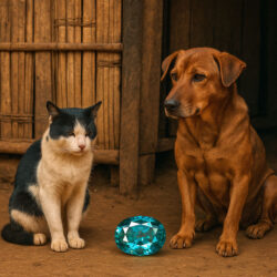 Een eenvoudig verhaal over trouw en bedrog, met een kat en een hond als onwaarschijnlijke helden. De koning wil een kostbare steen, de vrouw gelooft een list en de edelsteen verdwijnt naar het paleis. De kat sluipt, de hond beschermt, en onderweg verliezen ze de steen aan vissen, kraaien en otters. Uiteindelijk brengt slimheid huis en hart terug.