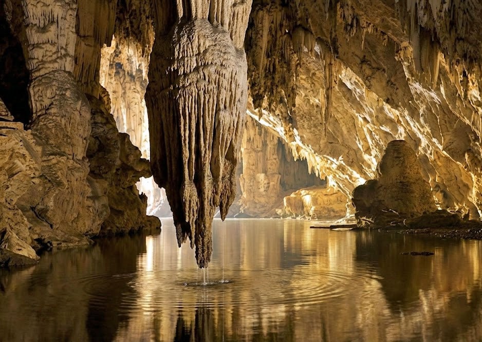 Het laatste deel van de grot bereik je per bamboevlot. Samen met een lokale gids vaar je geruisloos over de ondergrondse rivier. Het enige geluid komt van het water en vleermuizen boven je hoofd. Het zachte licht van een olielamp laat de wanden kort oplichten, waarna alles weer verdwijnt in het donker.