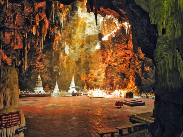 Bezienswaardigheden9 februari 2026Zonnestralen in Tham Khao Luang Cave maken deze Thaise tempelgrot onweerstaanbaar