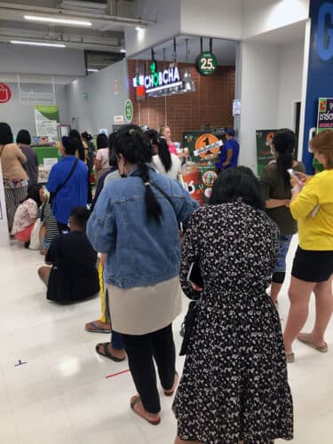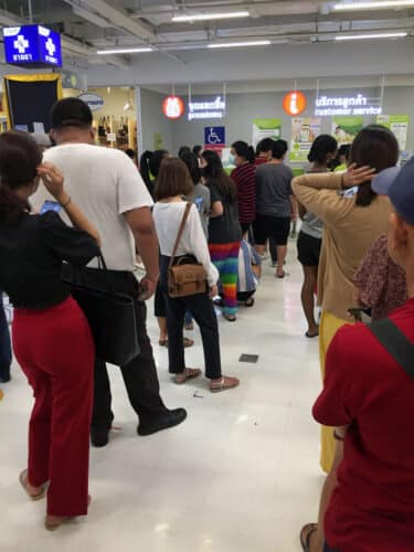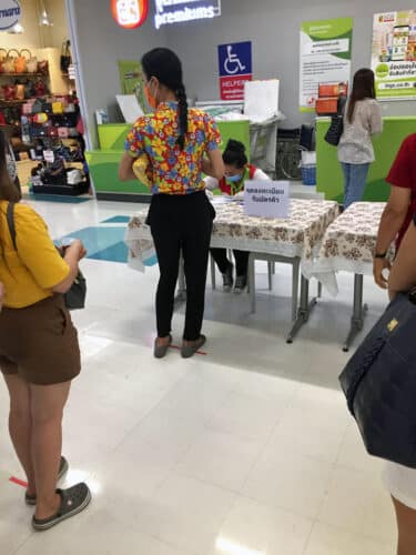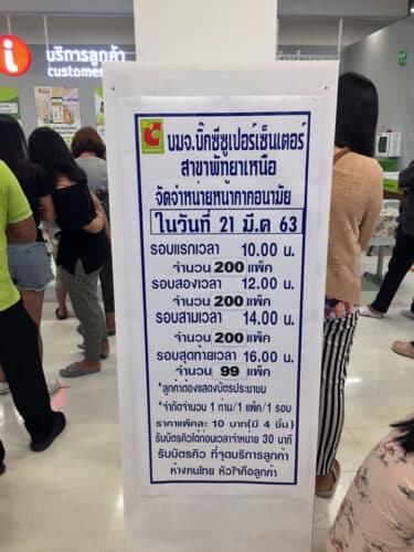 Er stond een bord met daarop de uitgifte tijden: 10, 12, 14 en 16 uur. Voor het bedrag van slechts 10 Baht zou je dan wel 4 maskertjes kunnen krijgen, maar dan alleen op vertoon van een geldige ID! Ik was er om 15 uur en sloot aan in een van de 4 rijen wachtenden. Dus moest ik nog ongeveer een heel uur wachten in die rij waar NIEMAND 1,5 meter afstand hield van zijn of haar voorganger. Zie foto’s. Dat was dringen geblazen…