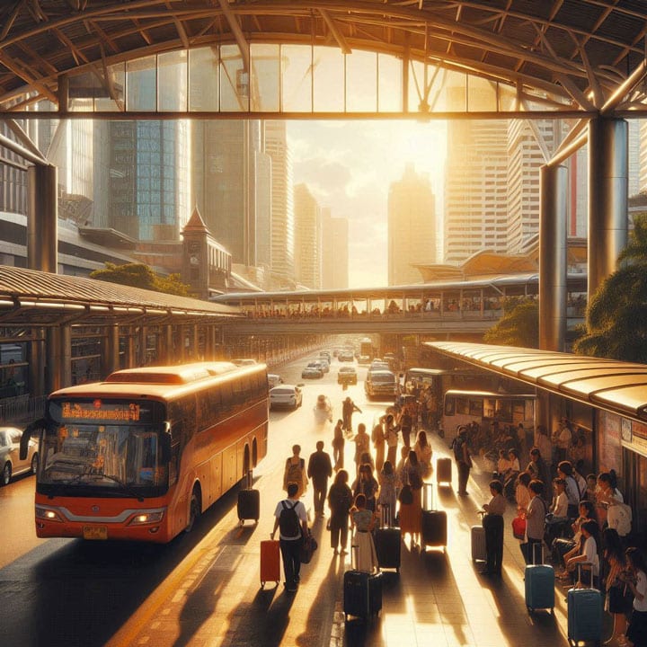 Nu is het hele gereis vanuit Nederland tot en met de voordeur in Isaan nogal een onderneming, zeker wanneer men reist met een klein ventje van een paar jaar oud. En dan vooral zo’n uitvoering die zowat de hele vlucht huilt of schreeuwt en de eeuwige vervloeking van kinderloze mannelijke Thailand-gangers op leeftijd uitlokt. Dus dan maar lekker in de bus verder om de opgelopen vliegtrauma’s wat af te bouwen tijdens de laatste etappe richting schoonfamilie. Fijn vroeg in de ochtend stond de taxi al klaar om ons van het hotel naar het busstation te vervoeren. De vriendelijke luitjes van de receptie hadden het geel-groene transport voor ons al opgetrommeld. Bustickets hadden we zelf al geboekt. Zo ver zo goed. We kwamen aan en de taxichauffeur zette ons en onze koffers netjes neer in de buurt van onze bus. Daarna stoof hij er goedgemutst vandoor op weg naar zijn volgende ritje die ochtend. Zoals gebruikelijk was het een heerlijke zonnige dag in Bangkok, op het randje van te heet of daar al net overheen. Er heerste de gebruikelijke gezellige drukte bij het busstation die echt schreeuwt dat de vakantie nu echt is begonnen. Onze koffers werden heel behulpzaam door de chauffeur in de royale en vrij lege bagageruimte geschoven en we namen comfortabel met zijn drietjes plaats in de twee voor ons gereserveerde zetels. De meeste passagiers reisden licht, met slechts een rugzak of een doos vol exotisch voer.