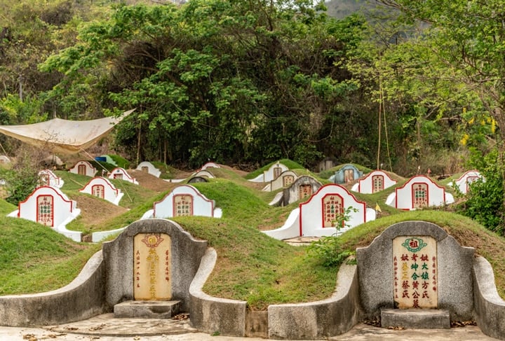Honderden kleine heuveltjes met aan een zijde een marmeren (gedenksteen, altaar).