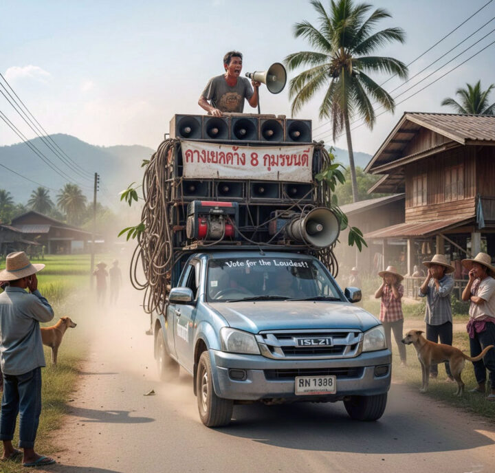 Het is februari 2026 en de hel is losgebarsten in mijn normaal zo slaperige dorp. Nee, de vulkaan is niet uitgebarsten en de prijs van de kleefrijst is stabiel. Het is erger: de democratie is gearriveerd. Aanstaande zondag, 8 februari, zijn er parlementsverkiezingen en dat zullen we weten ook. Sinds een week rijden er pick-uptrucks rond met geluidsinstallaties die zo krachtig zijn dat ze nierstenen kunnen vergruizen op vijftig meter afstand.