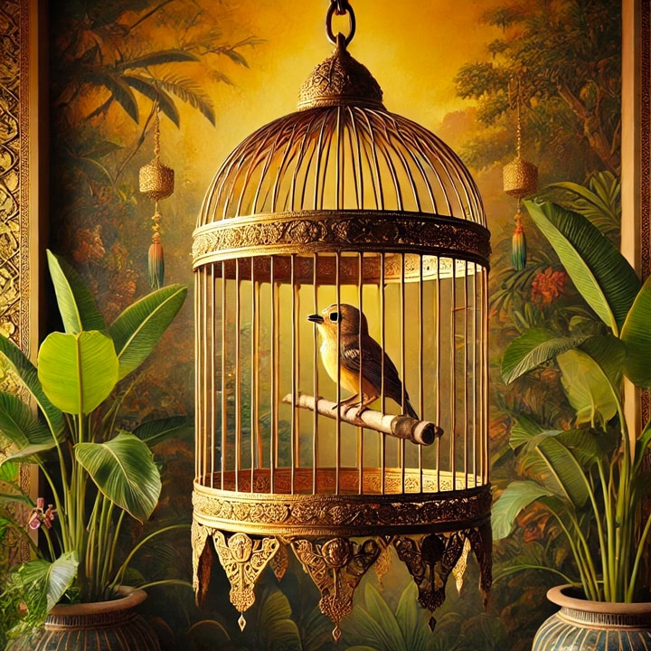 Gebonden door de veiligheid van het gouden kooitje met bladgoud aan de buitenkant, wat aan de binnenkant, zoals gezegd, vaak behandelt, is met loodmenie, fladdert men rustig in de rondte totdat toevallig twee bladgouden kooitjes elkaar treffen tijdens het ophangen aan de steunbalk op het terras van het gouden kooitje.
