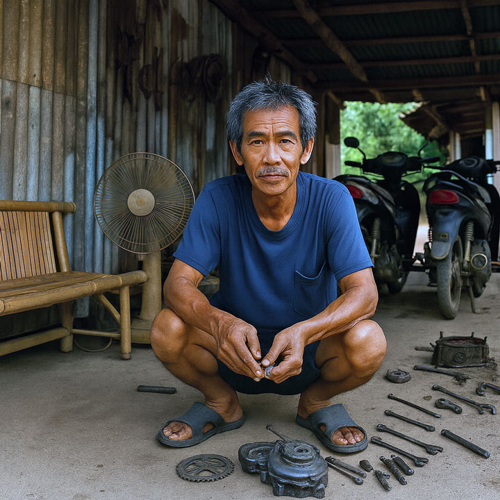 Preecha heeft een werkplaats van golfplaten, een bamboebankje, drie werkloze brommers en een ventilator die alleen op vrijdag werkt. Hijzelf zit meestal gehurkt tussen onderdelen die al tien jaar op hun wederopstanding wachten.