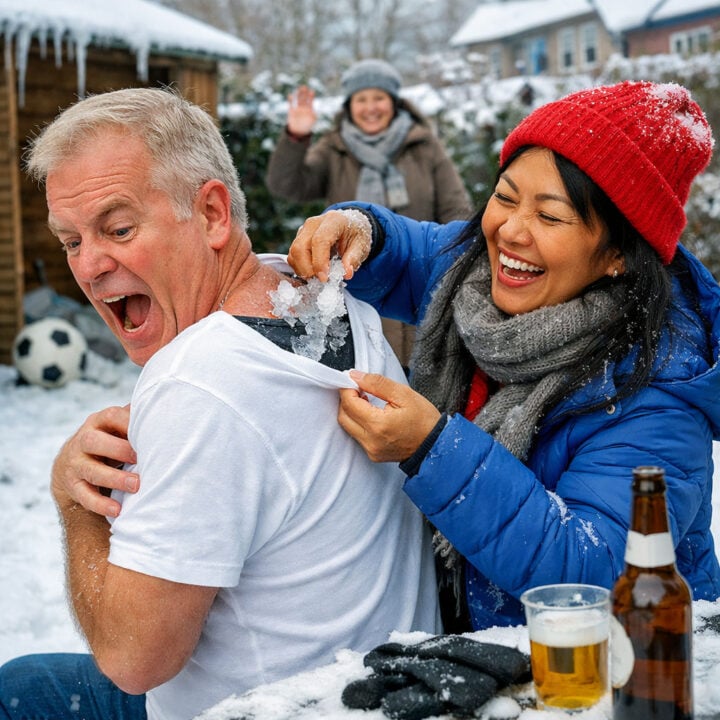 Zo te zien en vooral te horen heeft een goedgeplaatste sneeuwklomp op de blote rug zijn weerga niet, waarbij schoonzus op de achterbank ontploft van het lachen.
