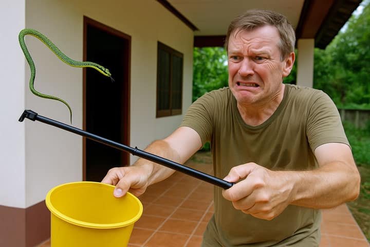 Hahaha, wat een avontuur… Ik heb zelf heel wat slangen uit onze tuin verjaagd. De eerste slang deed ons besluiten onze open Thaise keuken om te bouwen tot een afgesloten, vast onderdeel van ons huis.