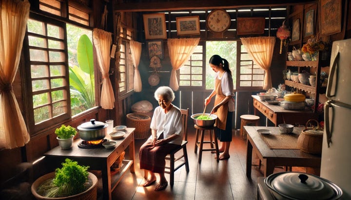 Als we in Udon Thani op bezoek zijn bij schoonmoeder neemt mijn vrouw steeds heel zorgzaam de controle over het leven van het oudje volledig over. Ze slaat er zich eigenlijk de rest van het jaar ook met succes doorheen zonder de bemoedering door haar dochter, maar in de weken van onze aanwezigheid wordt ze toch voor even ‘gedegradeerd’ tot een hulpeloos kind op leeftijd waarvoor op moederlijke wijze gezorgd moet worden. Douchen mag ze nog zelf, maar voor eten, (af-) wassen, poetsen, transport, inkopen, rekeningen betalen en doktersbezoekjes heeft ze nu de beschikking over een zorgzame voogdes. Ze hoeft er ook niet om te vragen. Het gebeurt allemaal spontaan.