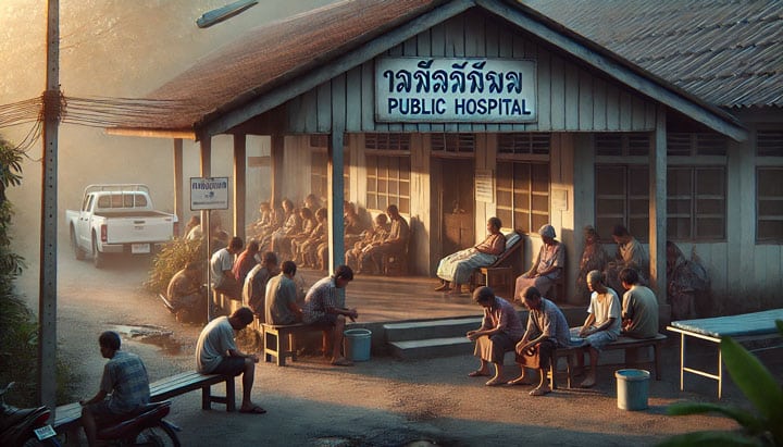 Onlangs toen schoonmoeder flink verkouden was moest ze een paar keer naar het ziekenhuis daarvoor. De gebruikelijke antibiotica run. Ik kreeg in een spoedcursus uitgelegd waarom niet voor het staatsziekenhuis gekozen wordt. 7 uur in de ochtend daar zijn en dan wachten op een consult. Soms de hele dag tot de dokter dan al naar huis blijkt te zijn en de resterende patiënten morgen terug mogen komen. Dan ook weer dezelfde procedure. Tot de patiënt uiteindelijk vanzelf genezen is of dood in de wachtkamer ligt. Bij wijze van spreken dan. Wie zich met hangen en wurgen vaak doodziek 50 kilometer lang achter op een ossenkar of te voet naar dit oord van genezing heeft verplaatst zal dan behoorlijk balen. Er is geen klachtencommissie of gratis accommodatie voor de overblijvers. Ik zie ze soms op rieten matjes slapen in ons park aan de overkant, samen met familieleden van anderen die op bezoek zijn bij opgenomen patiënten, maar geen geld hebben voor een hotel of een koffie verkeerd bij Starbucks of Amazon. Zelfs voor het bocht van de 7-Eleven ontbreekt het kleingeld.