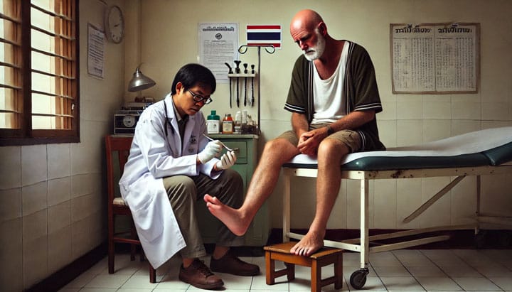 Even later kwam de dokter binnen, liep vlot aan de comaman voorbij en sneed even het abces aan mijn teen open met een vlijmscherpe schaar. Zonder verdoving en blikken of blozen. Hij viel duidelijk niet in de categorie van zachte heelmeesters. Mijn gepiep en gekerm was kennelijk ongepast en ik werd streng verzocht me te beheersen. Gelukkig duurde de mishandeling maar een minuutje of zo, maar ik waande me voor even in een middeleeuwse martelkamer, met als wezenlijk verschil natuurlijk het achterliggende argument van de pijnvolle behandeling. Verbandje erom en pillen ophalen, inclusief penicilline waar ik uiteraard geen nee tegen zij. Mijn principes inzake resistentie waren als sneeuw onder de Thaise zon verdwenen, al was inmiddels de avond ingevallen. De eindafrekening bedroeg 3700 baht, maar er kwam daarover geen klacht over mijn lippen.