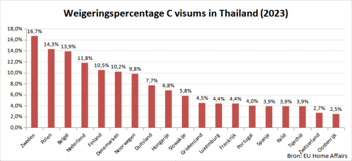 Nederland weigerde in 2023 11,8% van de Thaise aanvragen. Ter vergelijking: in 2013 was dit nog 2,4%, tikte zelfs de 1,0% aan in 2014 en steeg vanaf toen jaarlijks, naar 5,7% afwijzingen in 2019.
