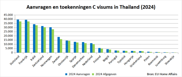 Een kleiner onderdeel, maar onbelangrijk is Thailand nu ook weer niet te noemen. Wereldwijd werden er bijna 729 duizend aanvragen voor een Schengenvisum gedaan bij een Nederlandse post. Vooral vanuit Turkije (13,3%), India (12,5%), Indonesië (7,5%), China (9,9%), de Filipijnen (6,7%) en Marokko (5,3%). Thailand komt op een 17de plaats met ruim 11 duizend aanvragen (1,5%).