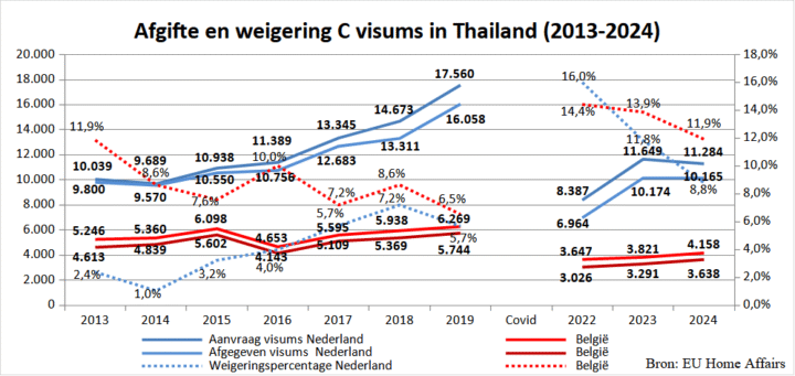 In Thailand werden ruim 265 duizend Schengenvisums aangevraagd en bijna 247 duizend daadwerkelijk afgegeven. Dit is ongeveer vergelijkbaar met de aantallen over 2023, toen werden er 270 duizend aanvragen gedaan. Het recordjaar blijft nog steeds 2019 met bijna 338 duizend aanvragen. Tijdens de covidperiode zakte dit naar een historisch dieptepunt en blijkbaar zijn de visumaanvragen nog steeds niet terug op het oude niveau.