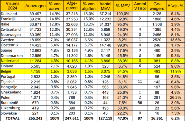 Een tabel met het aantal aanvragen, goedkeuringen en weigeringen voor Thailand in 2024. MEV is Multiple Entry Visum. VTBG is een visum met een territoriale gebiedsbeperking, je mag dan slechts een beperkt aantal lidstaten juist wel of juist niet betreden.