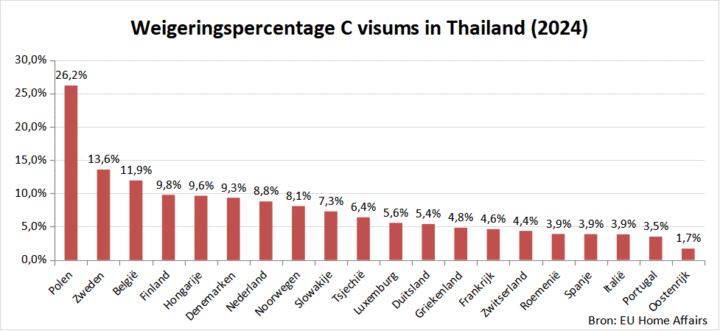 Nederland weigerde in 2024 8,8% van de Thaise aanvragen. Dat is dus iets hoger dan het EU gemiddelde, maar minder dan het in 2023 opvallend hoge getal van 11,8%. Ter vergelijking: het aantal afwijzingen was in 2014 historisch laag met 1,0% en steeg vanaf toen jaarlijks, naar 5,7% afwijzingen in 2019.