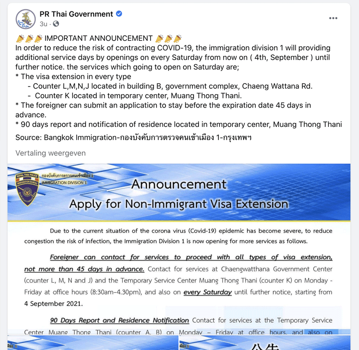 Om het risico op besmetting met COVID-19 te verkleinen zal Bangkok Immigration Div 1 vanaf 4 september, en dit tot nader order, ook geopend zijn op zaterdag.