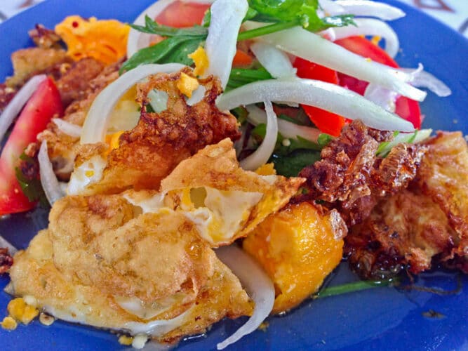 Heb net zo,n salade gekregen van mijn schat met gebakken aardappel schijvjes en met khai Dao (gebakken ei)!!