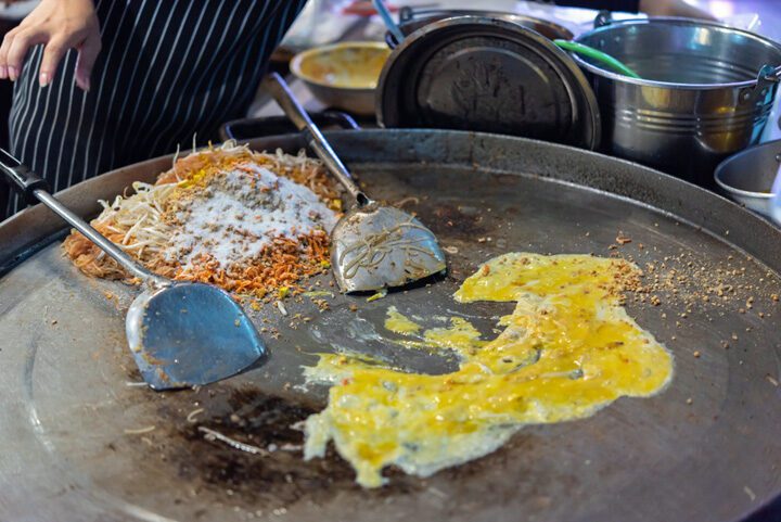 Khao San Road is een van de bekendste straten van de Thaise hoofdstad Bangkok. Dit is de uitvalsplek voor de vele duizenden backpackers die de stad jaarlijks aan doen. De straat en de buurt er omheen is vergeven van hostels, markten, reisbureaus, kroegjes en niet te vergeten de vele eetstalletjes waar voor een luttel bedrag een zeer smaakvolle maaltijd gekocht kan worden. Uiteraard zijn er vele rijdende kraampjes waar in slechts een paar minuten in een grote wok één van Thailand’s bekendste gerechten in elkaar ‘geschept’ wordt: Pad Thai noedels. Hoewel in Thailand overal redelijk authentiek gekookt wordt, is de smaak van de gerechten in een buurt als deze toch enigszins aangepast aan de smaakpapillen van de vele westerse monden. Maar waar moet je naartoe om de echte authentieke Pad Thai noedels te eten? Toevallig is dat vlakbij Khao San Road.