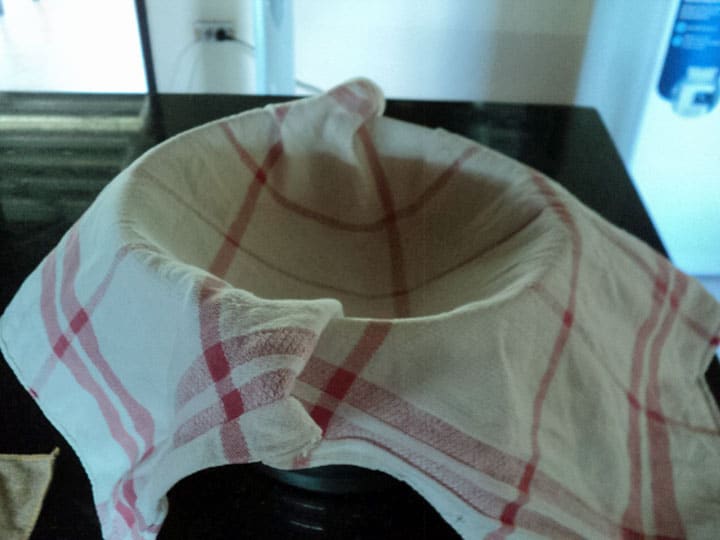 We leggen, een reeds vochtig gemaakte, keukenhanddoek in het vergiet. Met een pollepel scheppen we voorzichtig de bovenste laag kwark af en doen dit in onze filter. Niet te veel in een keer. We vouwen de overhangende delen van de handdoek, als een enveloppe, over de kwark. Met de hand kunnen we nu het meeste vocht, de wei, uit de kwark drukken. Deze wei kunnen we opvangen voor later gebruik. We scheppen dan opnieuw kwark af tot we merken dat het echt een te dunne massa wordt.