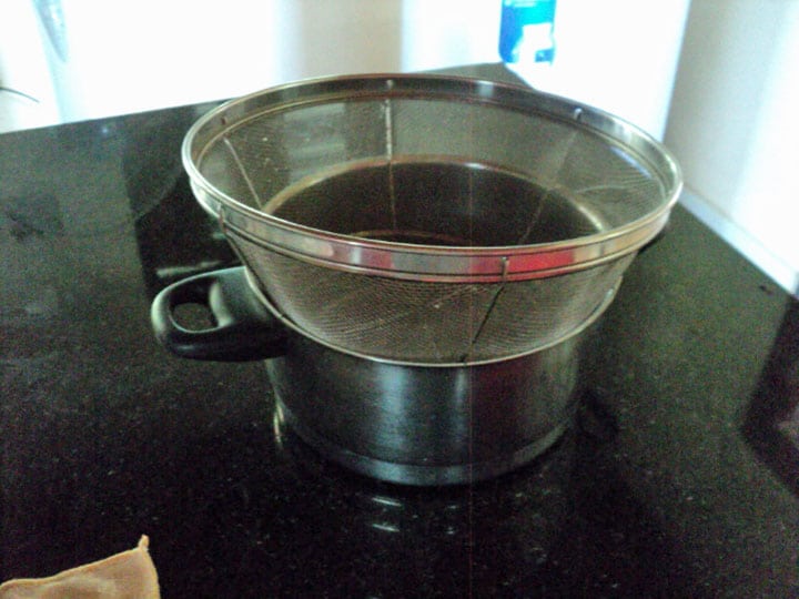 Na stap 1 is de eerste fermentatie zowat achter de rug. Het is nu tijd om te filteren. Hiervoor moet je wat creativiteit aan de dag leggen en zaken gebruiken welke je in je keukenarsenaal hebt. Ik gebruikte een metalen vergiet en een redelijk versleten keukenhanddoek als filter.