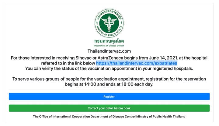 Voorheen accepteerde de website alleen registraties voor buitenlanders in Thailand ouder dan 60 jaar en mensen met onderliggende gezondheidsproblemen. Maar vanaf 14 juni kunnen alle buitenlanders zich registreren. Buitenlanders worden geadviseerd zich 2 weken voor de beoogde vaccinatiedatum aan te melden.
