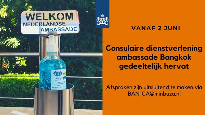 Het ministerie van Buitenlandse Zaken in Den Haag heeft besloten dat vanaf 2 juni a.s. de consulaire afdeling van de Nederlandse ambassade in Bangkok voor een aantal diensten zal worden heropend.