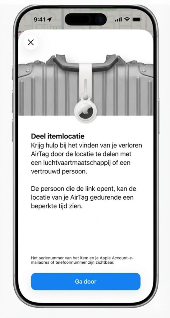 Een belangrijke vernieuwing is de functie waarmee je tijdelijk de locatie van een AirTag kunt delen met derden, zoals luchtvaartmaatschappijen. Apple werkt hiervoor samen met meer dan vijftig airlines wereldwijd.