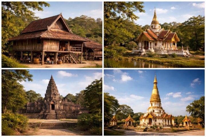 Isaan heeft geen vaste bouwstijl, maar een familie van stijlen die samen een herkenbaar regionaal beeld vormen. Juist de combinatie van houten paalwoningen, sobere sim, Lan Xang-invloeden en Khmer-monumenten maakt deze streek architectonisch rijk. Als je daar reist, zie je niet alleen hoe mensen bouwen, maar ook hoe ze leven.