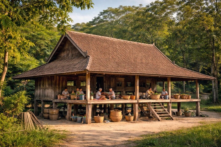 De bouwstijl die je in Isaan het vaakst tegenkomt, is de traditionele houten woning op palen. Die huizen zijn sterk verbonden met het landbouwleven en met de Lao-wortels van de regio. Ze staan hoog boven de grond, zodat lucht onder de vloer kan bewegen en de woonruimte beter beschermd is tegen vocht, modder en dieren. Onder het huis ontstaat een open plek die gebruikt wordt voor opslag, handwerk, rust of simpelweg voor het dagelijks leven in de schaduw.