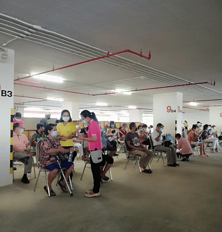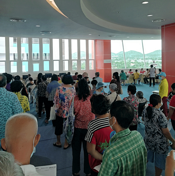 Uiteraard deed ik wat ook de overige gegadigden deden: veel te vroeg aanwezig zijn, uit angst dat het vaccin op was (of een andere bottleneck). Iemand had bedacht dat de mensen zich moesten verzamelen op de 9de etage van de nieuwe parkeergarage. De afhandeling kon dan geschieden in het auditorium op de 10de. Dus in een volle lift naar boven, in de hoop dat zich geen superspreader had aangemeld. Op het parkeerdek kregen we een nummer en papieren die we moesten invullen met de bijgeleverde balpen. Uiteraard alle vragen naar gezondheid etc. in Thai.