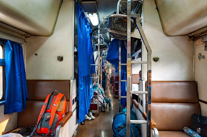 3e klas zittend op de grond en 1e klas nacht trein met 2 bedden per coupe en douches en toilet aanwezig.