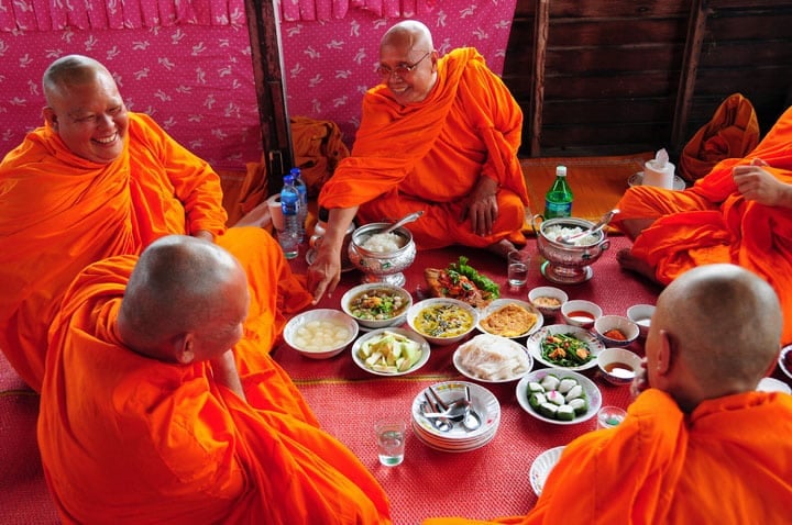 De vrouwen zijn de dag en nacht voor het tempelbezoek bezig met eten kopen en voorbereiden voor de monniken en voor de familie. Dat moet allemaal worden meegenomen. De mannen rijden de auto’s, 5 pick up trucks, afgeladen met familie, eten, potten en pannen en van alles wat men nog meer denkt nodig te hebben.
