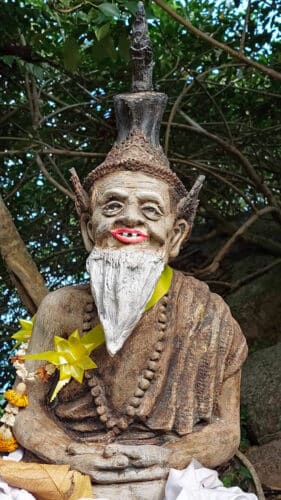 Na enkele foto’s van de prachtige omgeving gemaakt te hebben ga ik op zoek naar de geocache. Normaliter laat dat ding zich meestal vrij vlot vinden, maar hier is het andere koek. Op enkele meters afstand bekijkt een beeld van een of andere rare Thaise snuiter mij met bevreemde ogen. Dat belooft niet veel goeds, denk ik.