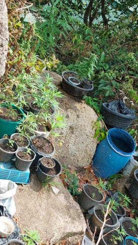 Om mijn poging de geocache te vinden beloond te zien wijk ik wat verder af van de opgegeven coördinaten. Wat zie ik na enig klauterwijk achter een stapel metershoge rotsblokken? Goed verstopt maar goed onderhouden staan daar tientallen potten met kleine, grotere en zelfs oogstbare (denk ik dan toch) hennepplanten.