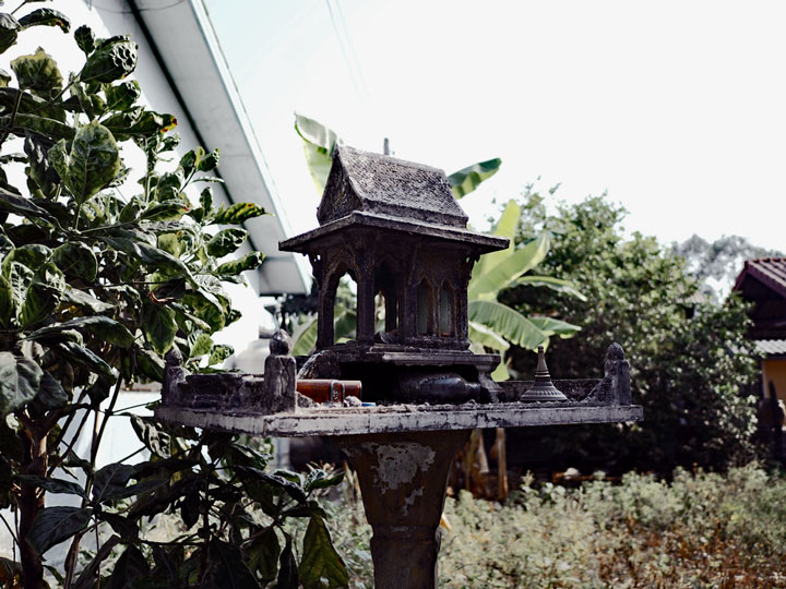 Op de uiterste hoek van het open stuk grond, grenzend aan de wijdse Thaise polder, staat een geestenhuisje. Ooit felrood van kleur, is het nu door de tand des tijds en ongenadige zon een vaag verhaal geworden. Ik had het al vaker vanuit de verte bekeken, en was zoals altijd licht gefascineerd door wat die Thai toch bezielt om dit soort dingen overal neer te plempen.