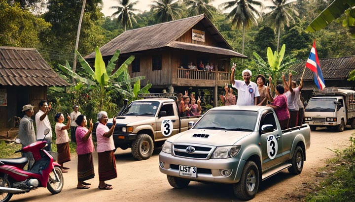 Jaren geleden zat ik aan m’n muesli-ontbijtje. Stopt er ‘n dame op ‘n motosai voor de deur; Chaantje moest komen en kreeg 500 Bath. Kwartiertje later wéér prijs ; wéér 500 Bth ! Dat was verkiezingsgeld!