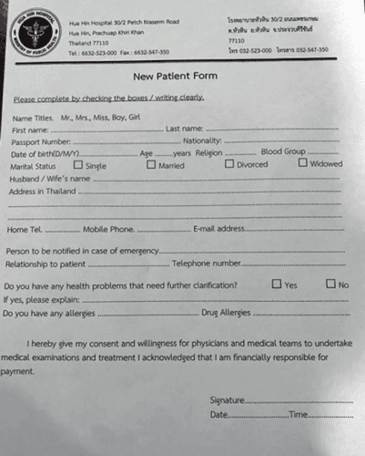Nee blijkbaar kan elk ziekenhuis bekijken welke behoefte die heef. De ene doet dat oip een formulier, zoals die van dit artikel. In Kantharalak is het gewoon een klembord met een lijst met een zestal kolommen. Daar op vul je naam, paspoort/ID, geboortedatum, telefoonnummer, of je medische klachten hebt. Verder maakt het toch niet uit.