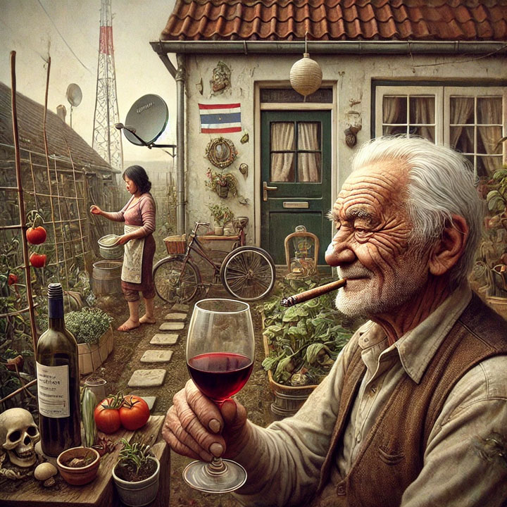 Mijn opslagcapaciteit van wat eens gewoon small talk was is de laatste jaren wat achteruit gelopen, soms zelfs gehold. Zo was hij niet alleen vader en grootvader, maar had hij ook al een paar huwelijken achter de rug. Altijd een harde werker geweest, waaronder ook piloot voor rondvluchten boven Limburg en het aangrenzende Duitsland en België. Huizen gehad en weer verloren door echtscheidingen en een paar keer het ziekenhuis in gemept door een junk van een zoon, die hem ook nog eens financieel erg pijn had gedaan, waardoor hij nu eigenlijk financieel berooid was, zij het niet straatarm. Gewerkt in allerlei branches, maar nu na zijn pensioen nog slechts als installateur van satelliet schotels, via een samen met een vriend opgezet bedrijfje, waar de opdrachten eerder uitzondering dan regel waren. Het waren zware tijden. Daarnaast wat incidenteel tuinonderhoud en andere klusjes die kwamen aanwaaien om zijn AOW wat aan te vullen. Want werken kon hij nog als een paard of in zijn geval een pony, want hij was een vent van zakformaat. Ik zeg dat niet denigrerend maar gewoon zodat we allemaal een beeld hebben van zijn afmeting en niet alleen ik. Dat vlijtige zag je ook aan zijn stadstuintje, dat versierd was met allerhande bouwsels en ornamenten, deels voor de leuk en deels om de verse soms exotische groenten voort te brengen waar zijn liefje zo dol op was. Want geld wilde hij liever niet in grote hoeveelheden in de supermarkt achterlaten en al helemaal niet in de toko waarvan hij de prijsstickers belachelijk hoog vond. Wel moest er in het huishoudbudget ruimte zijn voor elke dag een glaasje rode wijn en een sigaartje dus de plaatselijke middenstand kon toch nog wel wat aan hem slijten af en toe.
