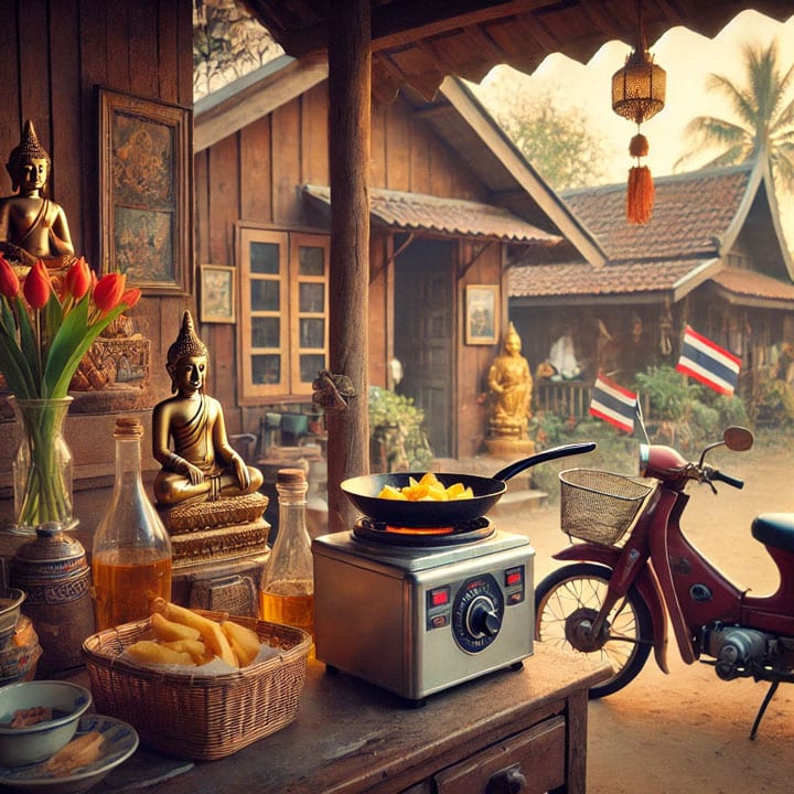 Intussen woonde hij nog bij zijn schoonouders in, die beiden natuurlijk flink jonger waren dan hun voortvarende schoonzoon. Ze waren echter enorm verguld met hem wegens het geschenk van de eerste kleinzoon en natuurlijk ook door het economisch opkrikken van het dorp door de komst van deze AOW trekkende ouderling. In het ouderlijk huis van zijn vrouw bakte hij dan friet van verse aardappelen in de uit Nederland meegebrachte frietenpan en voelde zich daarbij dan ook net als thuis. Het was pure nostalgie. Helaas stond er die dag geen patat op het menu; de aardappelen waren allemaal op en dus ik moest die avond thuis nog watertandend aan de gekookte rijst. Wel gezonder natuurlijk. Boodschapjes zoals brood en kaas haalde hij op zijn brommertje een paar Soi’s verderop, maar dat moest nog gebeuren dus de koelkast was leeg. Wel kregen wij een lekker koel glas water voorgezet wat een vast onderdeel is van de Thaise gastvrijheid, wat aangaf dat hij al behoorlijk was geïntegreerd in de plaatselijke maatschappij.
