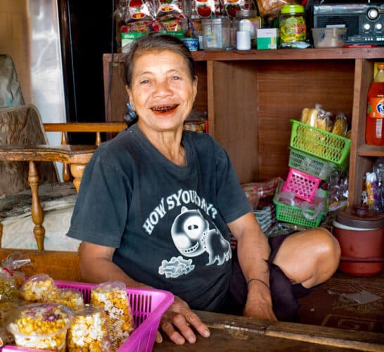 Vervolgens komt Oy’s tante uit Phimai me voor de geest, zijnde een betelnoot-kettingkauwer. Het uitgebrande dorp in haar mond wordt als afschrikmiddel slechts overtroffen door haar gewoonte te pas en te onpas een straal bloedrood sap op straat te petsen.