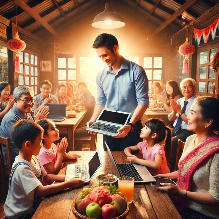 Door mijn werk heb ik toegang tot veel tweedehands computerapparatuur. Als ik de kans zie, neem ik altijd enkele laptops en tablets mee naar Thailand om daar weg te geven aan mensen die het hard nodig hebben voor werk of studie. Niet iedereen heeft de financiële middelen om dat soort spullen zelf aan te schaffen.