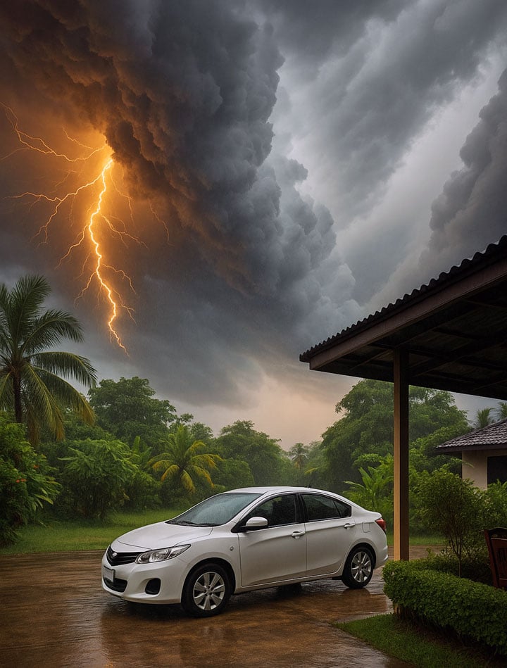 Donderdag gingen de buren richting het Khao Sok Natuurpark met de trein. Vandaag sta ik op met wat regen, een heerlijk koel windje uit het noorden. Ik heb energie en zin. De auto even wassen, want het is niet warm en wat beweging kan ik wel gebruiken na te veel donuts in Texas. Waterslang uitrollen en beginnen met ons vervuilde vehikel te schrobben. Kabang! Onweer, ineens dichtbij. Ik ben niet bang, maar heb er wel respect voor en besluit onder de veranda een bakkie te doen.