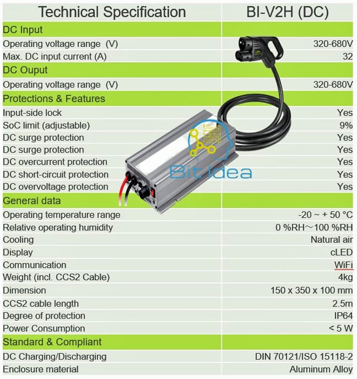 Voor het opladen van je EV heb je zonnepanelen nodig en de V2H lader. De meeste EV-laders op zonnestroom hebben een accu nodig. Deze lader niet, het laadt op, wanneer de spanning van de zonnepanelen 50-100V hoger is dan die van de accu van je EV. Er is geen omvormer nodig voor het opladen, zoals bij een gewone wisselstroomlader. Dus er is minder energieverlies. Want zonnepanelen werken met gelijkstroom. De V2H lader zet gelijkstroom van de zon direct in de accu, die ook op gelijkstroom werkt.